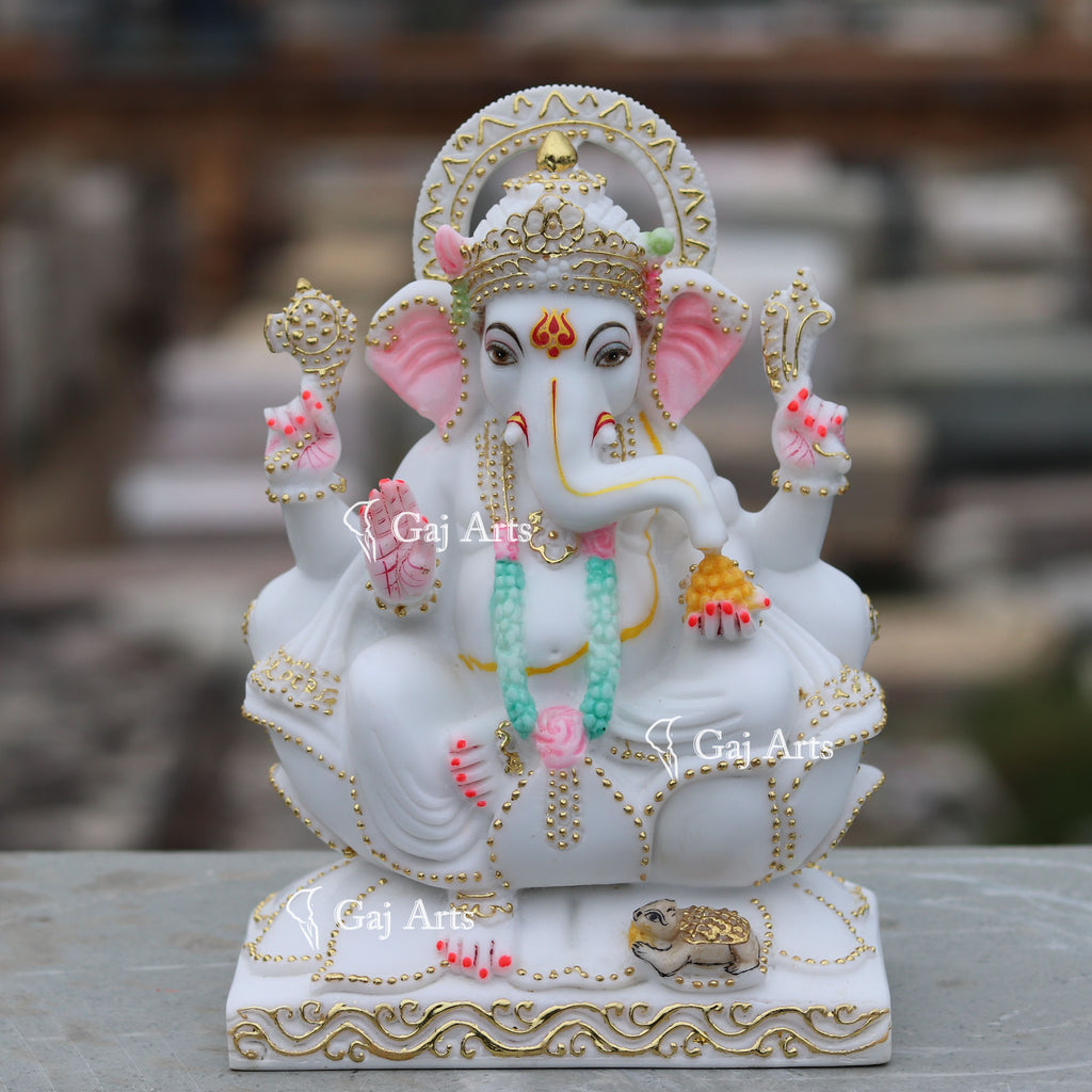 - Ganpati seating on a Lotus Base with his right hand held up in the abhayamudra, holding a noose, an elephant goad, and a bowl filled with his favorite sweets, laddus. Ganesh's vehicle; a rat is beneath Ganesh with modak .A beautiful garland in the neck.