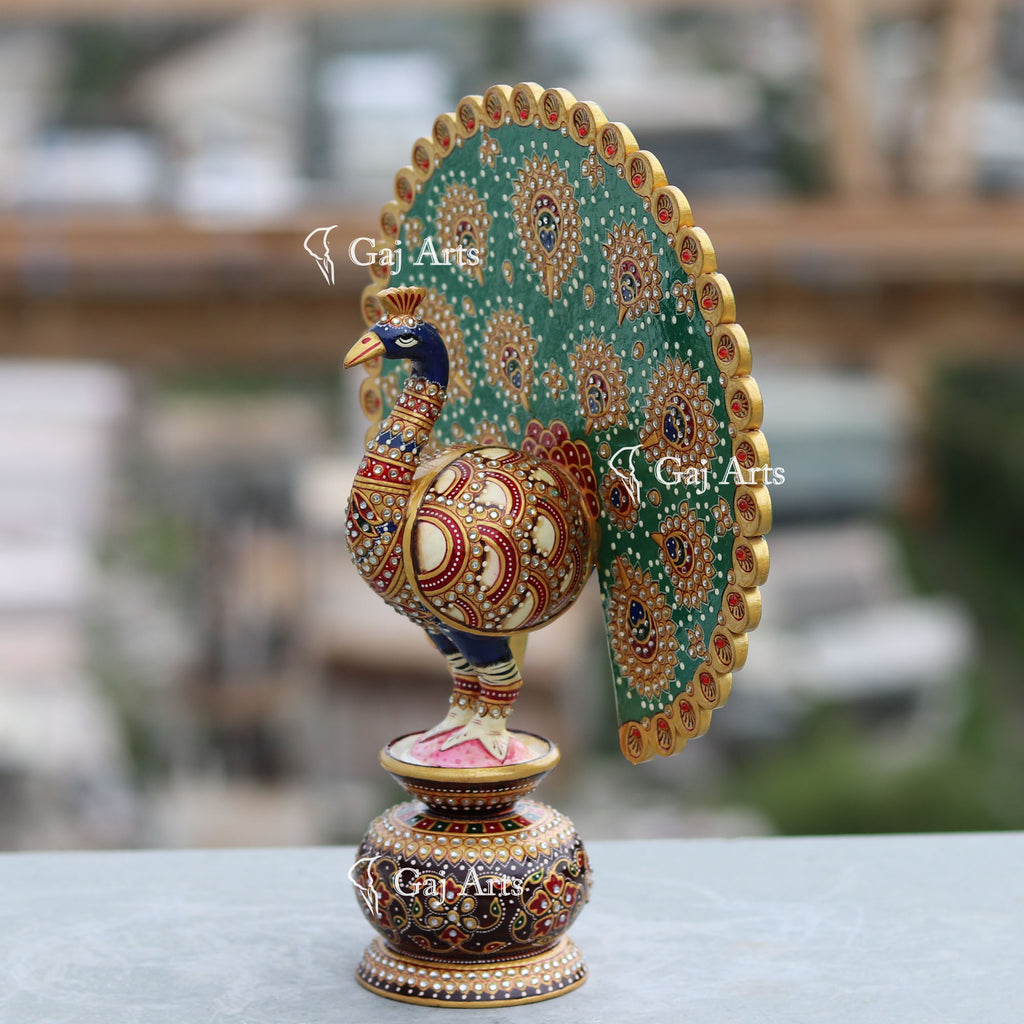 Presents a beautiful antique Wooden Dancing Peacock with attractive looking for showpiece and decorative ,This is the handmade wooden Painted Dancing Peacock Showpiece for home decoration of bedroom guestroom and livingroom . This is an attractive showpiece for table and temple or mandir décor . Mor pankh showpiece with unique and rare painting . Mor for gifting and gifts to your loved ones . Attractive return gifts. Peacock are known as the vahana of kartique son of shiva and parvati. People belives that peacock Brings good luck with them so bring home this peacock showpiece to your home and decor your home with this beautiful showpiece.