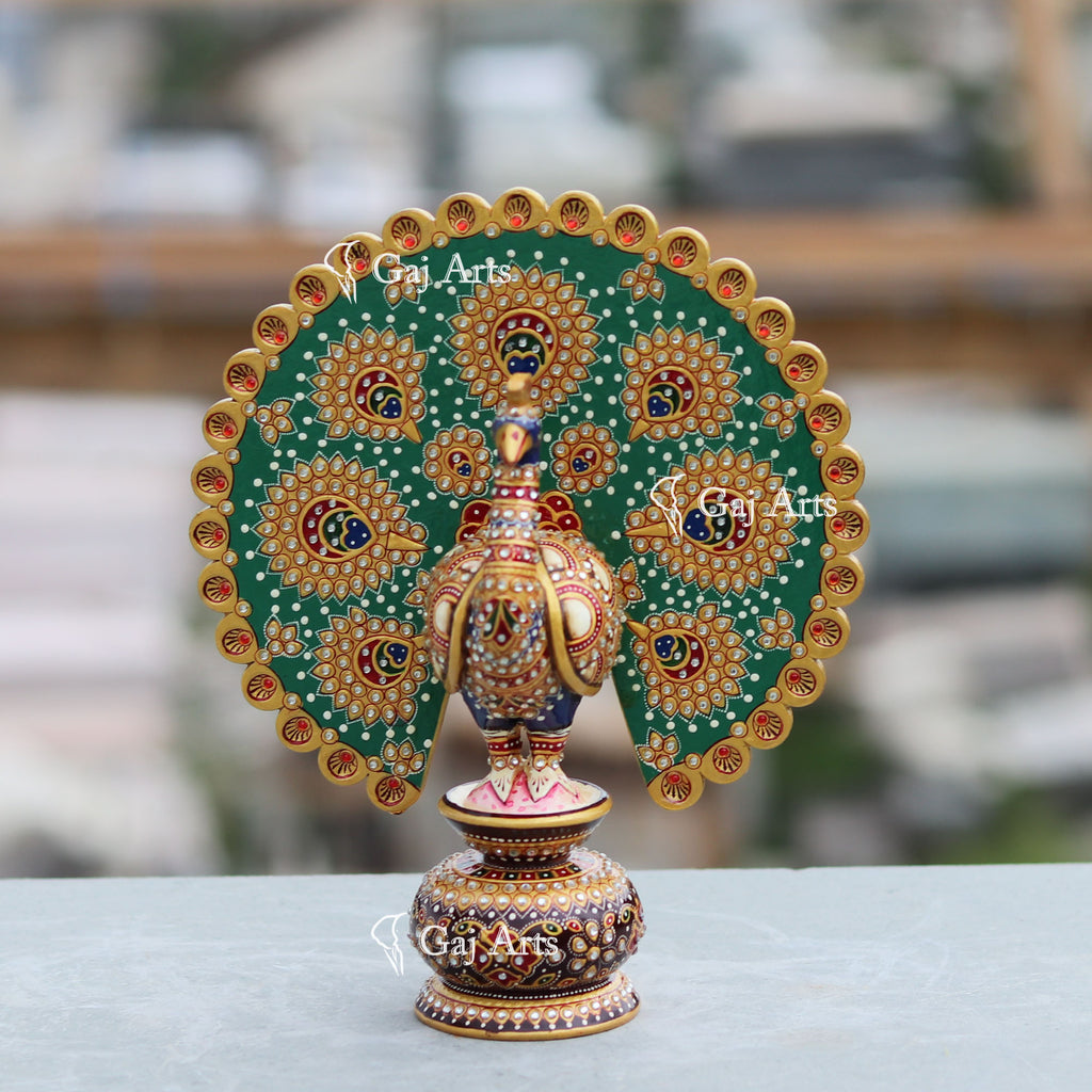 Presents a beautiful antique Wooden Dancing Peacock with attractive looking for showpiece and decorative ,This is the handmade wooden Painted Dancing Peacock Showpiece for home decoration of bedroom guestroom and livingroom . This is an attractive showpiece for table and temple or mandir décor . Mor pankh showpiece with unique and rare painting . Mor for gifting and gifts to your loved ones . Attractive return gifts. Peacock are known as the vahana of kartique son of shiva and parvati. People belives that peacock Brings good luck with them so bring home this peacock showpiece to your home and decor your home with this beautiful showpiece.
