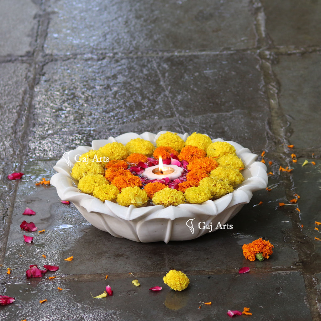2. Marble Flower Bowl, Flower Floater, Uruli, Home decoration, decorative Marble Flower Bowl, Shaped in a lovely flower. The intricacy of carving is incredible with all features clearly visible. It can be placed in Pooja room before the idols. It can also be placed right in the living room well complemented by other décor items and related interior design accessories or place in the balcony or entrance area to enhance peace of mind at home and office. It’s a charming item that could be a unique addition to your home, office, or special gift.