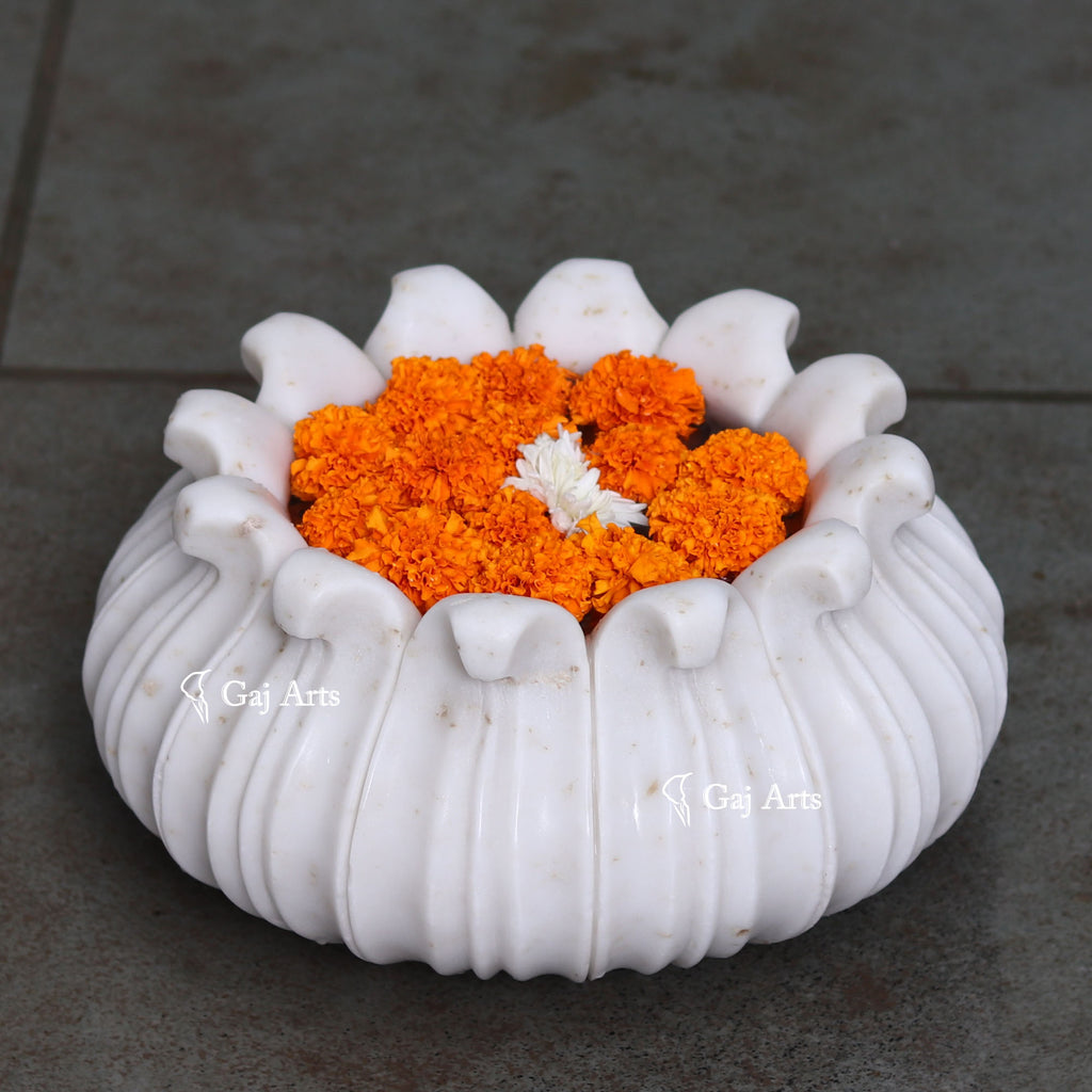 - Marble Flower Bowl, Flower Floater, Uruli,Home decoration, decorative Marble Flower Bowl,Shaped in a lovely flower.The intricacy of carving is incredible with all features clearly visible. It can be placed in Pooja room before the idols .It can also be placed right in living room well complimented by other décor items and related interior design accessories or place in balcony or entrance area to enhance peace of mind at home and office. It’s a charming item that could be a unique addition to your Home,office or special gift.