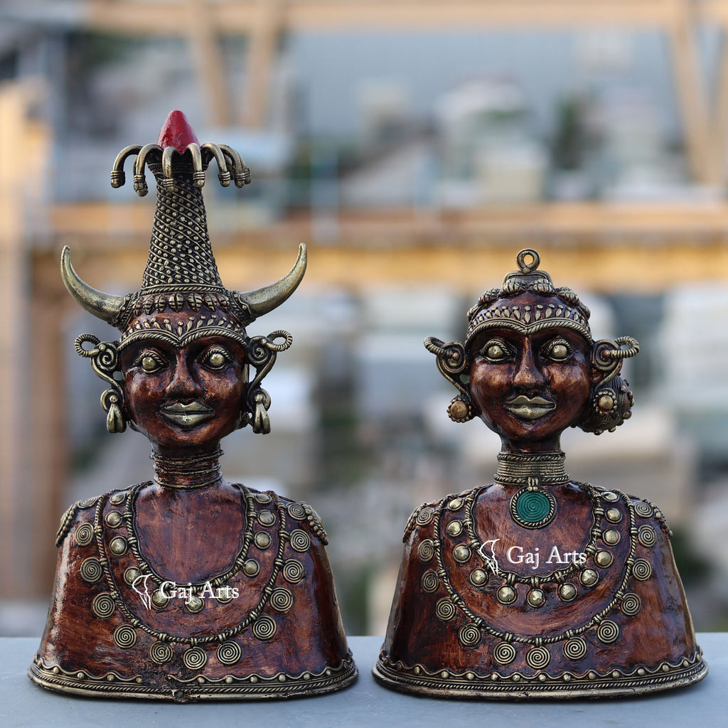 Dhokra Craft tribal couple statues An elegant and unique curio with a raw, rustic appeal to enhance your decor. Dhokra is a beautiful, ancient craft and amongst the oldest traditional techniques of metal casting in India, practiced for over 4,000 years. The lost wax technique, cire perdue is the medium of metalworkers in Madhya Pradesh, Chhattisgarh, Orissa and West Bengal. This craft dates back to pre-historic times of the Harappa and Mohenjodaro Civilizations. Entirely handcrafted, the unique 13 stage process of Dhokra/ tribal couple statues metal making is an outcome of the original craft instinct handed down through the centuries. Dhokra/ tribal couple statues metal is an alloy of brass, nickel and zinc that gives an antique effect to the castings.