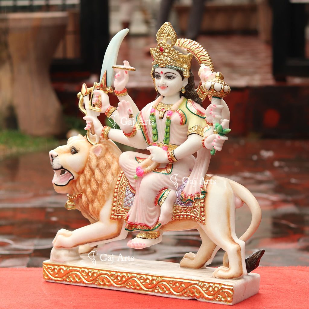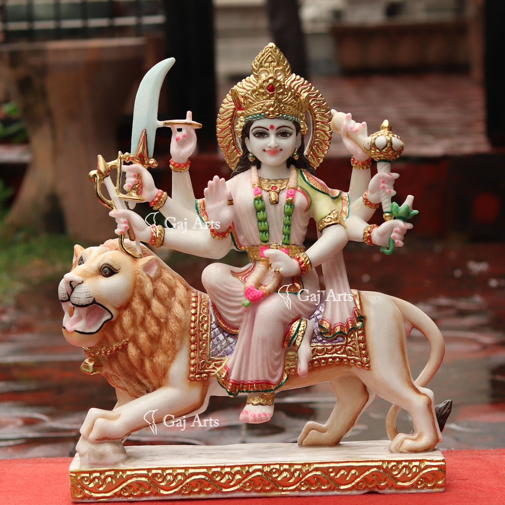 - Durga Mata has seated on her vahana a lion with her right leg down and left leg up.