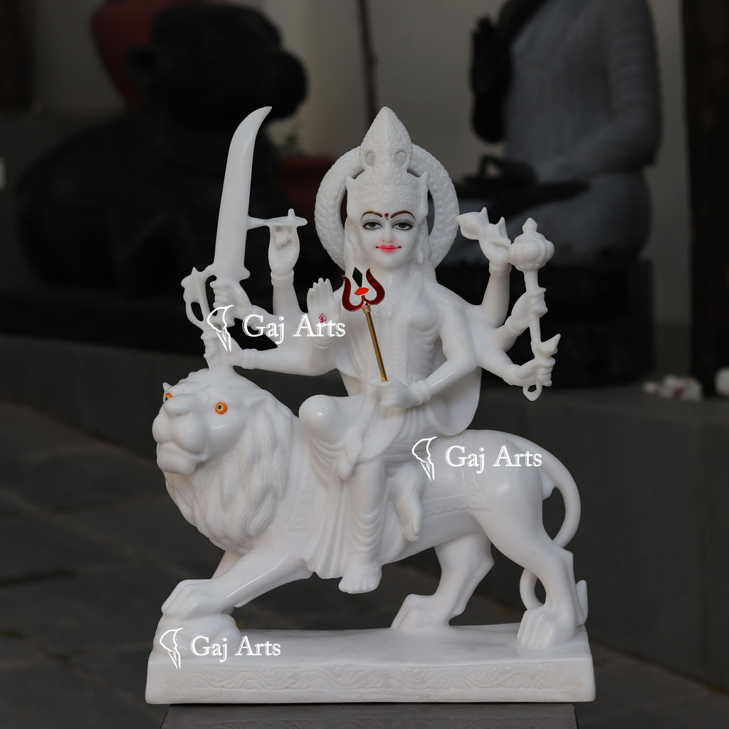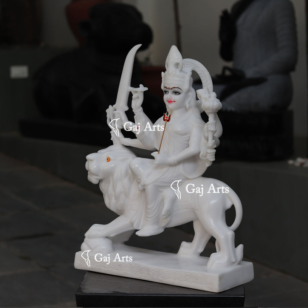 - Durga Mata has seated on her vahana a lion with her right leg down and left leg up.
