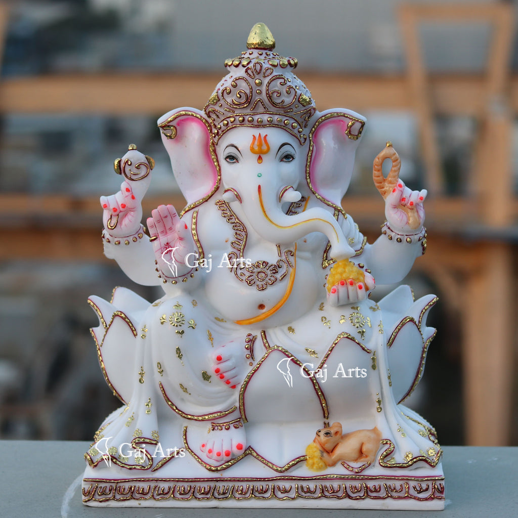 - Ganpati seating on a Lotus Base with his right hand held up in the abhayamudra, holding a noose, an elephant goad, and a bowl filled with his favorite sweets, laddus. Ganesh's vehicle; a rat is beneath Ganesh with modak .A beautiful garland in the neck.