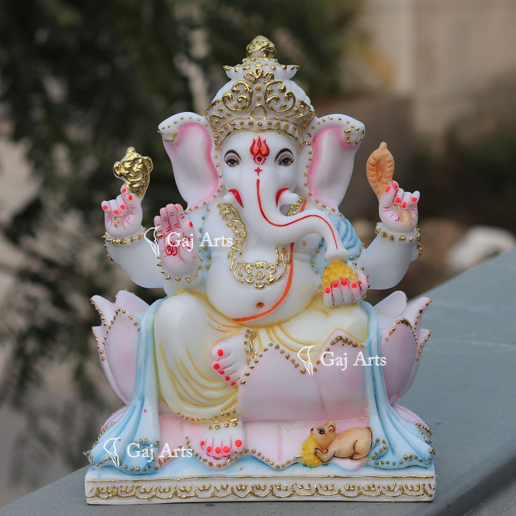 - Ganpati seating on a Lotus Base with his right hand held up in the abhayamudra, holding a noose, an elephant goad, and a bowl filled with his favorite sweets, laddus. Ganesh's vehicle; a rat is beneath Ganesh with modak .A beautiful garland in the neck.