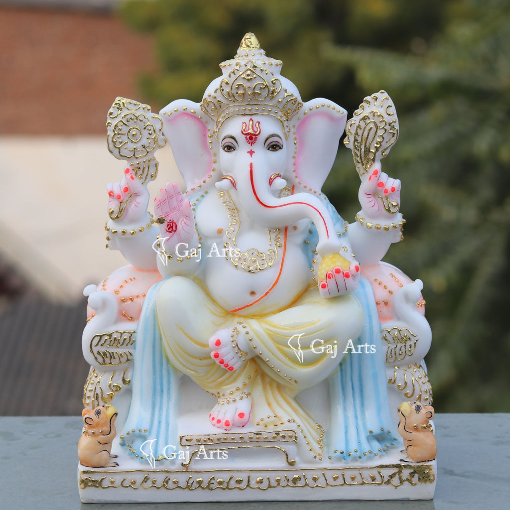 - Ganpati seating on a Singhasan Base (Throne) holding a Noose, an elephant goad,a lotus and a hand filled with his favorite sweets, laddus. Ganesh's vehicle; a Rat with modak is looking up to idol Ganesh .A bowl of Modak is there on the right side of idol.A beautiful Garland in neck of idol. Ganesh has a trident tattooed to his forehead, it’s used to symbolize the past, present, and future.