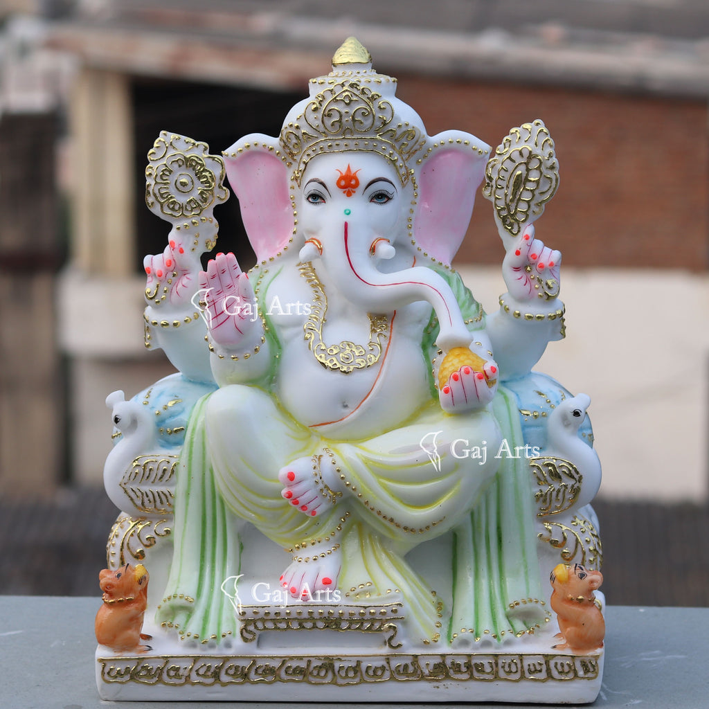 - Ganpati seating on a Singhasan Base (Throne) holding a Noose, an elephant goad,a lotus and a hand filled with his favorite sweets, laddus. Ganesh's vehicle; a Rat with modak is looking up to idol Ganesh .A bowl of Modak is there on the right side of idol.A beautiful Garland in neck of idol. Ganesh has a trident tattooed to his forehead, it’s used to symbolize the past, present, and future.
