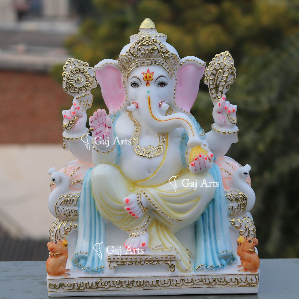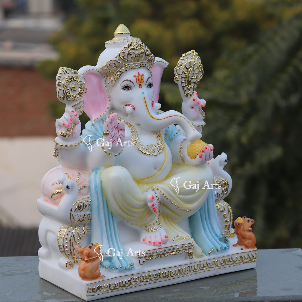 - Ganpati seating on a Singhasan Base (Throne) holding a Noose, an elephant goad,a lotus and a hand filled with his favorite sweets, laddus. Ganesh's vehicle; a Rat with modak is looking up to idol Ganesh .A bowl of Modak is there on the right side of idol.A beautiful Garland in neck of idol. Ganesh has a trident tattooed to his forehead, it’s used to symbolize the past, present, and future.