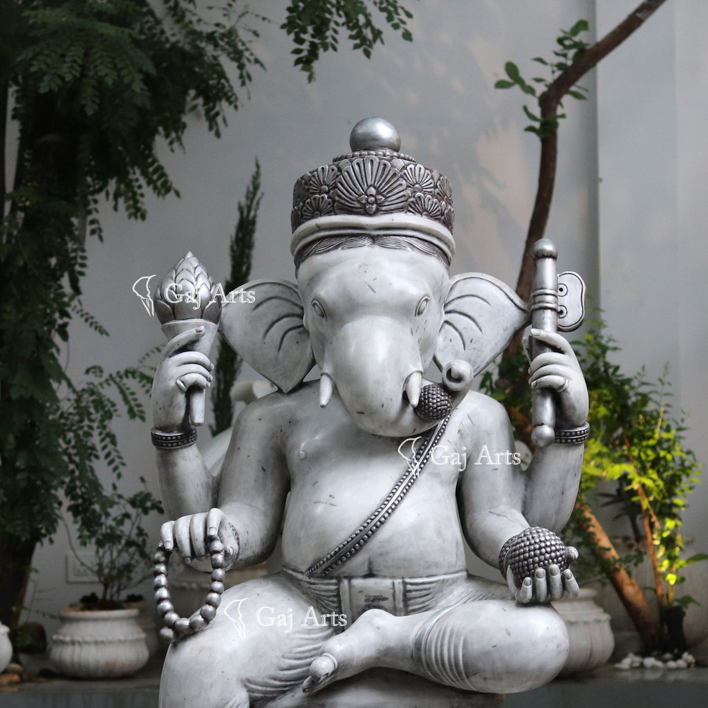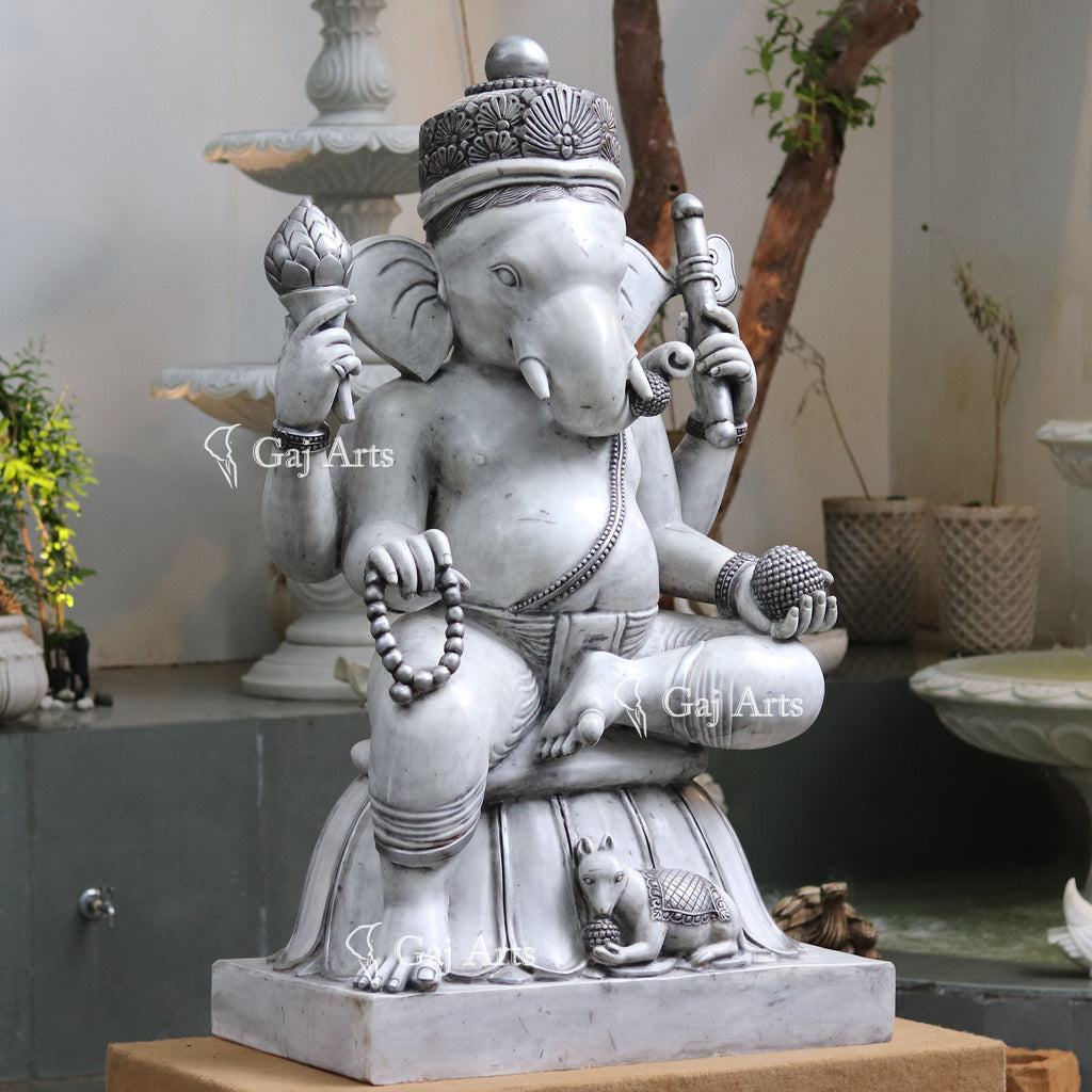 - Ganpati seating on a Singhasan Base ( Throne) with both side Pillow with his right hand held up in the Abhaya mudra), holding A Noose, an elephant goad and a hand filled with his favorite sweets laddus & his trunk is Swaying up. Ganesh has a trident tattooed on his forehead, it’s used to symbolize the past, present, and future. It is also a nod to his father, Shiva, who is represented by this trident symbol.
