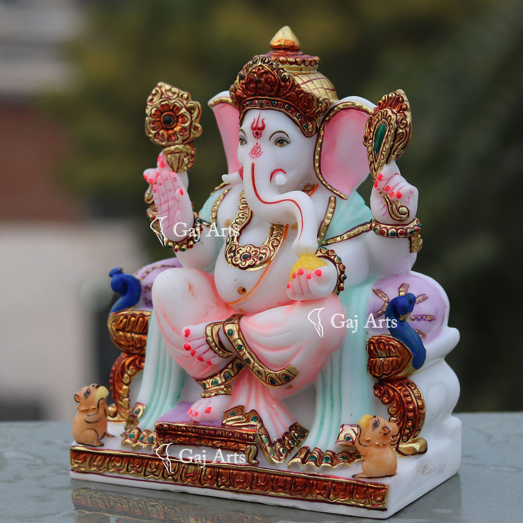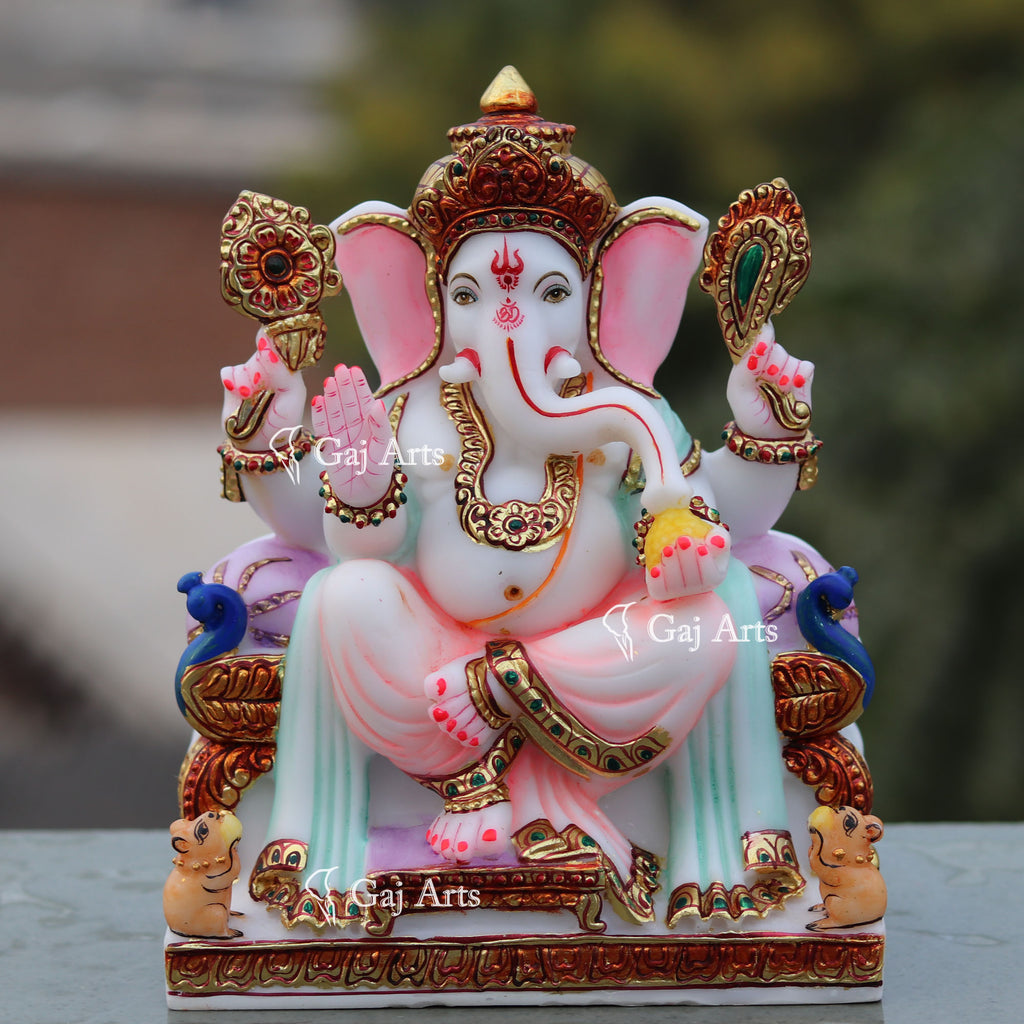 - Ganpati seating on a Singhasan Base (Throne) in lalitasana resting on both side pillows with his right hand held up in the Abhaya mudra, holding a noose, an elephant goad, and a bowl filled with his favorite sweets, laddus that his trunk is playfully trying to eat. Ganesh's vehicle; a rat is beneath Ganesh.