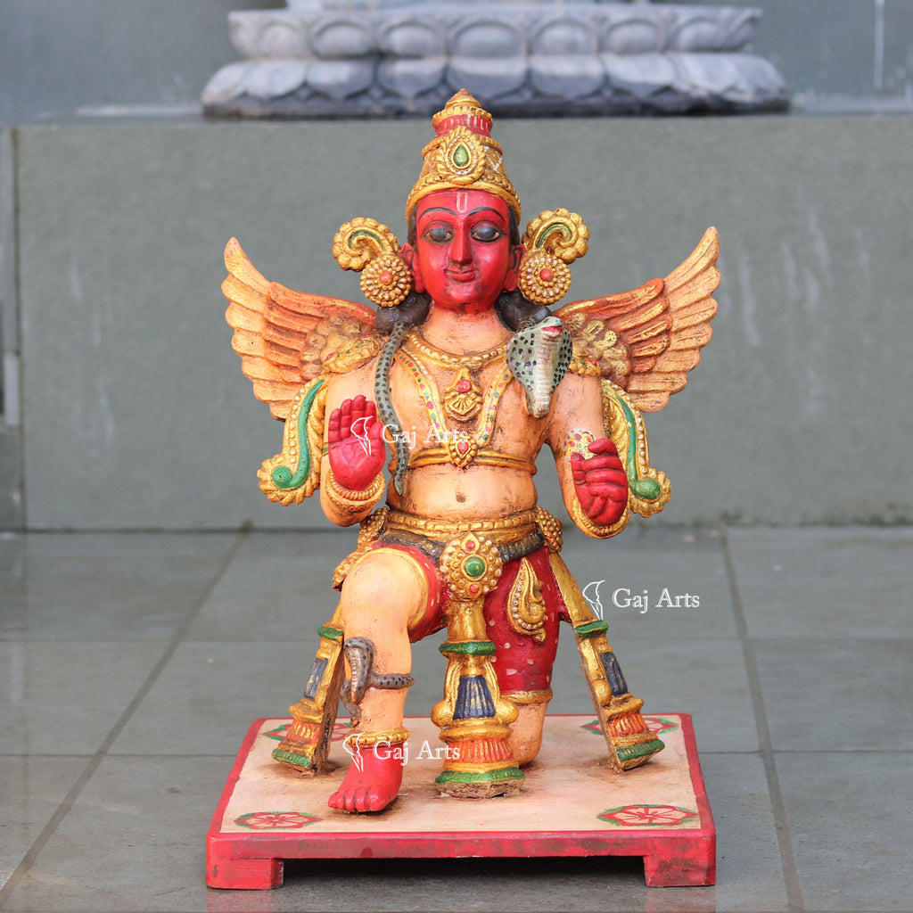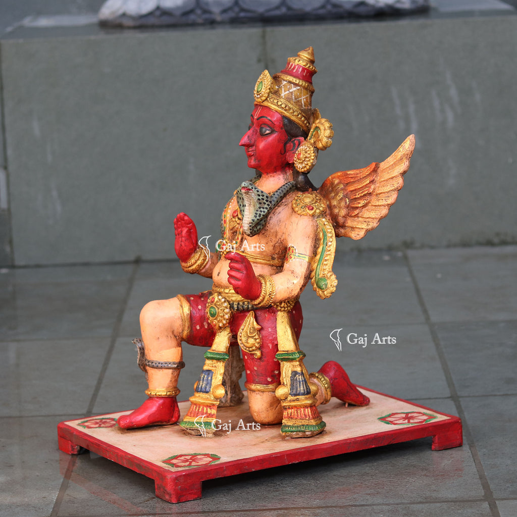 This beautiful handcrafted idol of Lord Garuda captures the essence of devotion and service. Made from high-quality wood, it features Lord Garuda sitting with one leg raised and both hands Ashirwad Mudra in a gesture of unwavering loyalty to Lord Vishnu. Every detail is hand-painted with care, showcasing the skill and dedication of the artisans who created it. This unique piece not only represents Garuda's eternal commitment to Lord Vishnu but also adds a touch of spirituality and elegance to any home.