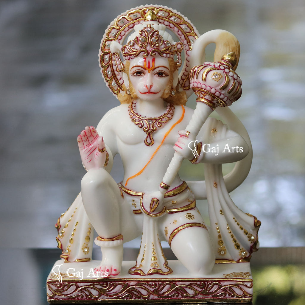 - Hanuman ji sitting in Ashirwad mudra(sign OM)& other hand holding Mace (gada). He wears a simple dhoti with his broad, Dupatta and muscular chest covered in a bevy of necklaces.