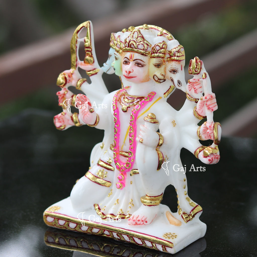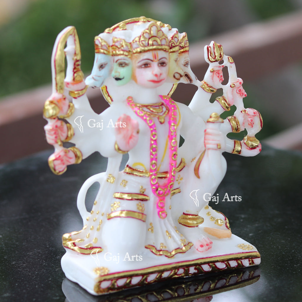 - Panchmukhi Hanuman has been Seated in Ashirwad mudra with Five heads & 10 arms holding different weapons. The 5 faces of gods areVaraha, Hayagriva, Hanuman, Narasimha, and Garuda. The Weapons are battle axe, disc, Gada (mace), Trishul, and the sword.