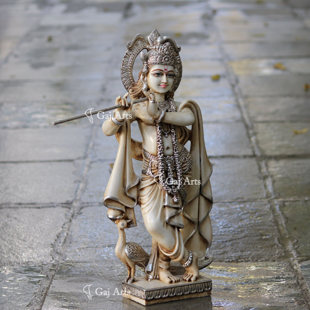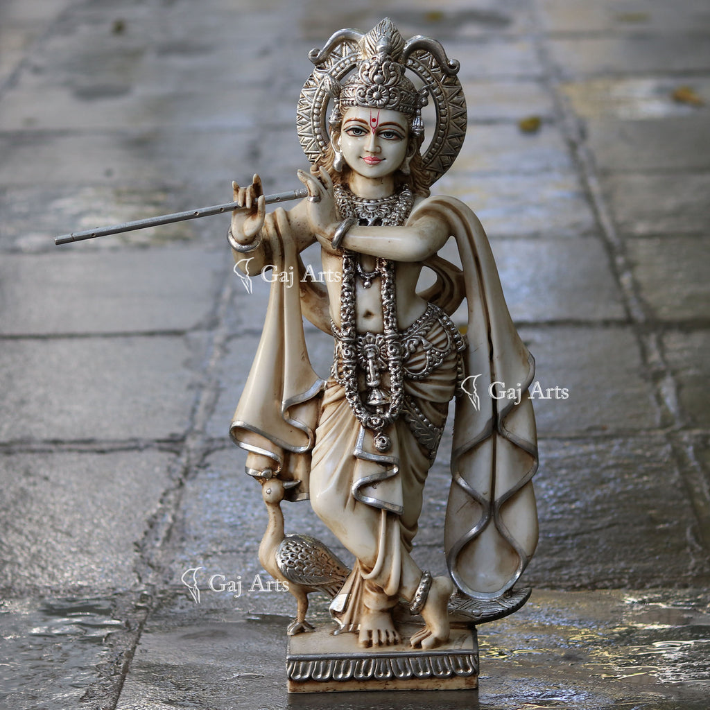 - He stands in a relaxed position with one leg over the other peacock face toward Krishna face, wearing a crown with a peacock feather in it, Dhoti with kamar Band, Garland & necklace in neck & holding Flute.