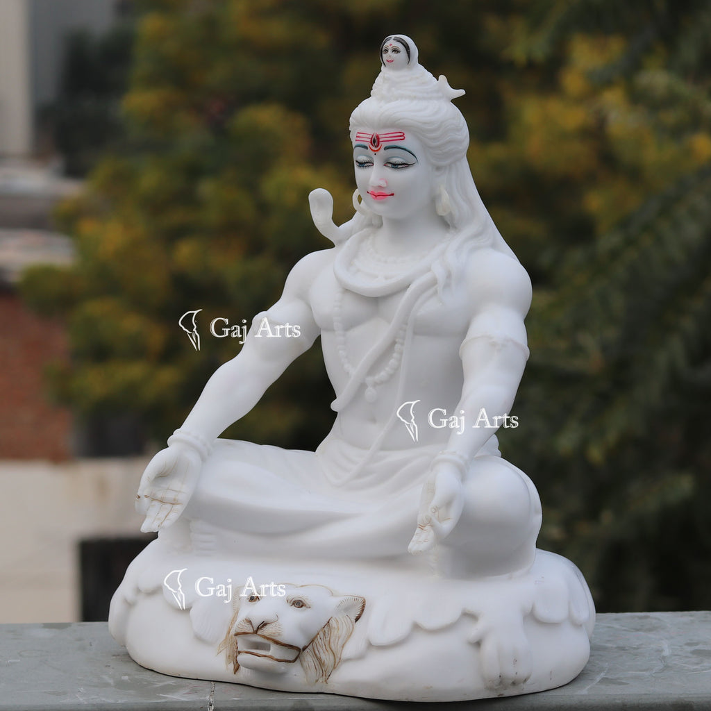 2. Lord Shiva sitting on Rock Base with a Bagmbari (tiger skin rug) in the Padmasana & Ashirwad Mudra . The powerful left arm resting on his knees. He is a muscled man clothed in tiger skin with rudraksha beads in neck, Naag (Cobra) around his neck, head, and arms, the adorning crescent moon, the holy river Ganga flowing from his matted hair.